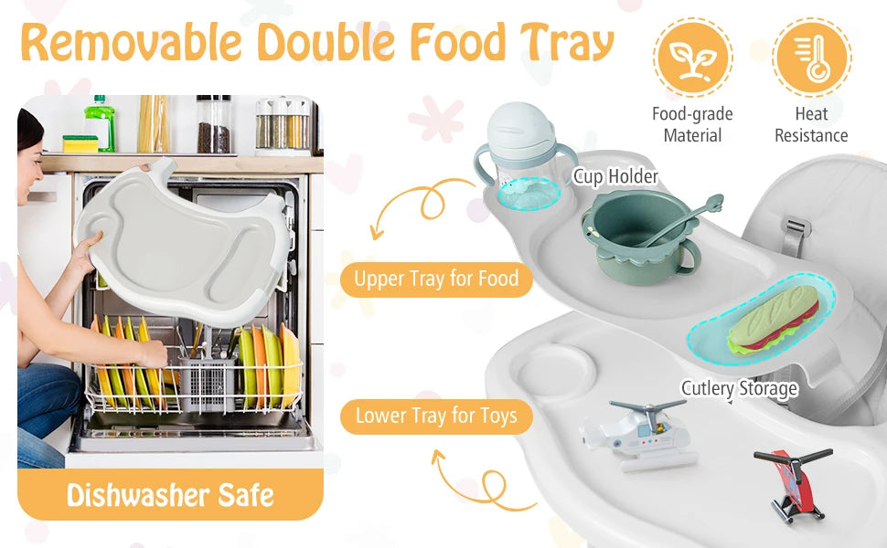 - Detachable Double Trays: Considering the variable use needs, our baby highchairs has a two layers tray. The trays are also detachable, the harmless PP materials also make them easy to clean and maintain. The top tray can be used for eating which have special grooves design and can be used as cup holder and cutlery holder. The bottom tray can be used for playing. And you can also remove the trays to use it as a toddler chair.