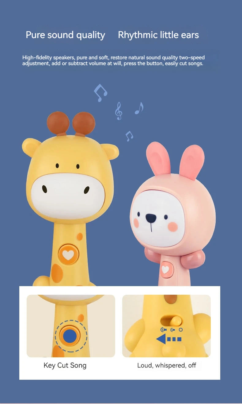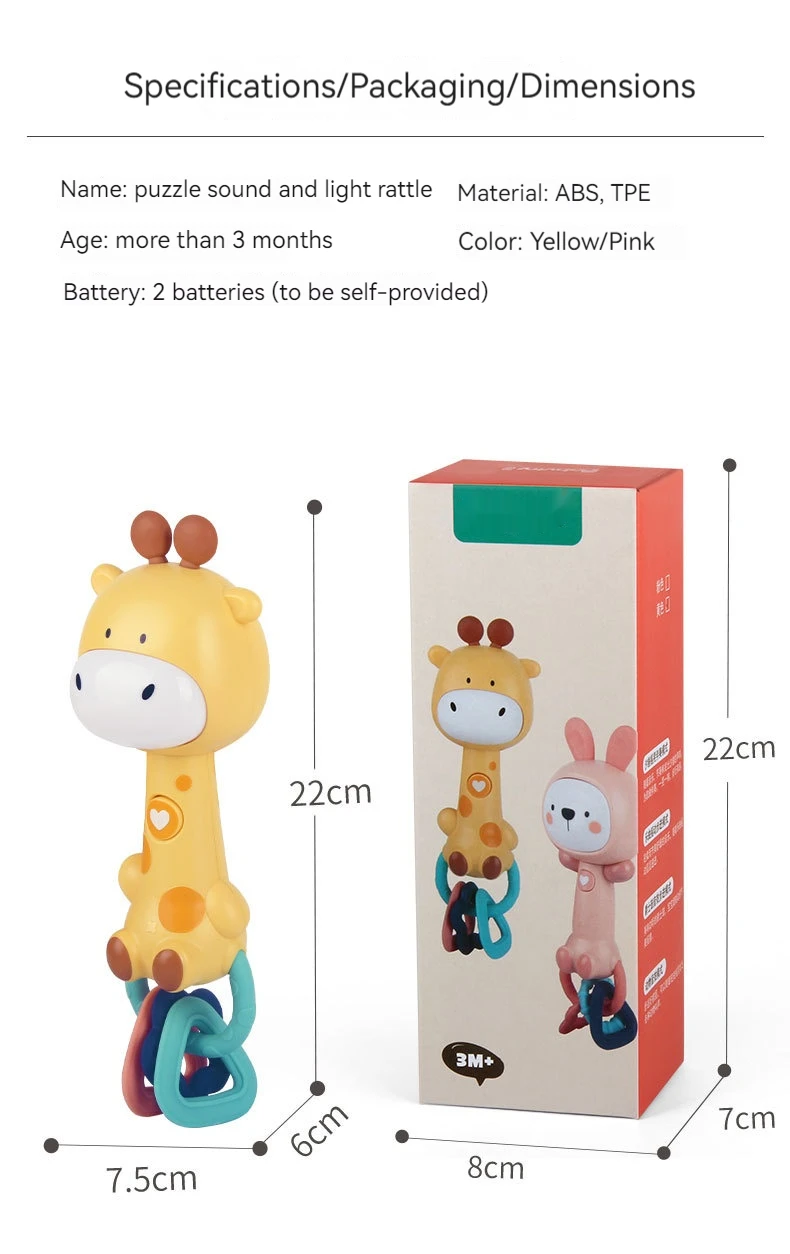 It is a multifunctional yellow music stick giraffe baby toy suitable for infants 0-6-12-18 months. It is not only a rattle toy with music and light, but also a baby teething toy. It not only helps with baby's sensory development, but is also very suitable for soothing children's sleep and parent-child interaction.