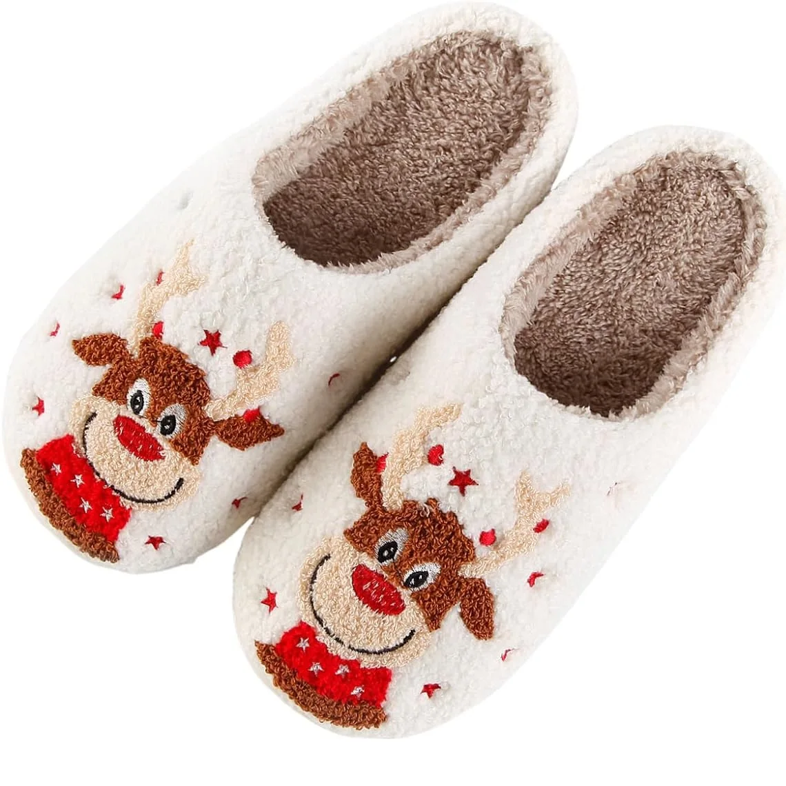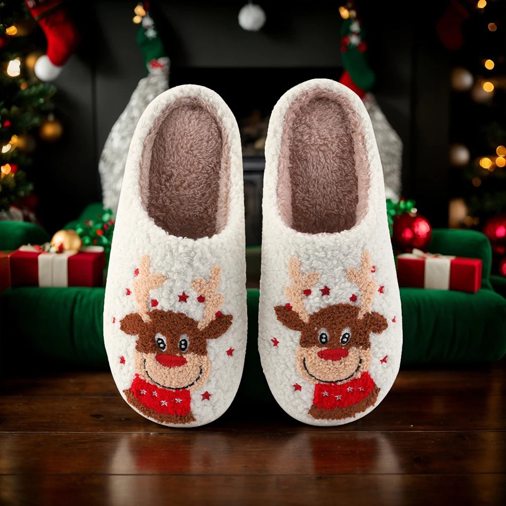 Christmas Elk Plush Slippers Comfortable Flat Thermal Slippers Anti Slip Fluffy Home Slippers Soft Couple Slippers for Men Women