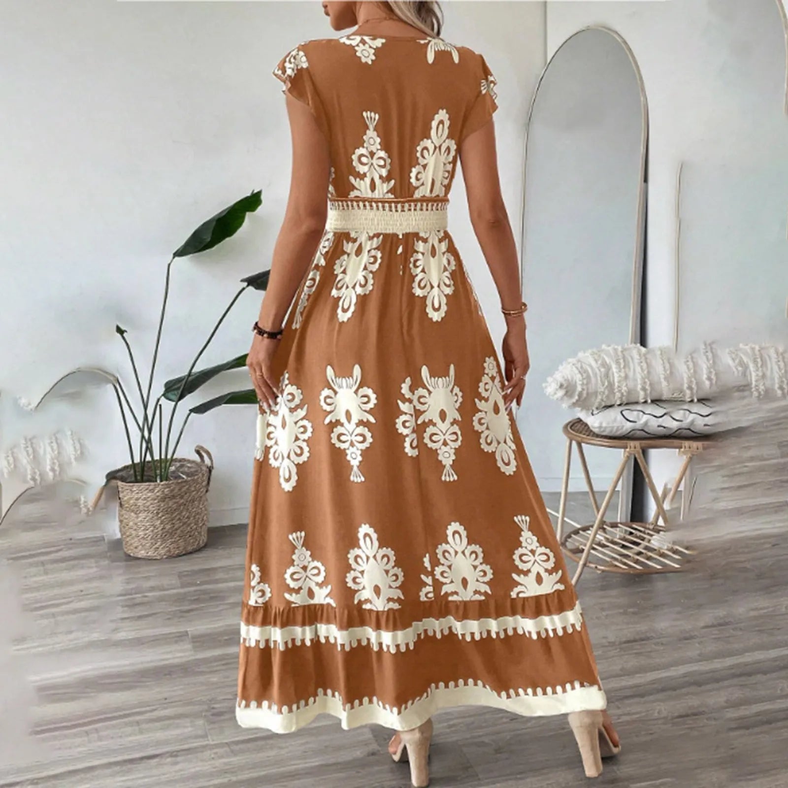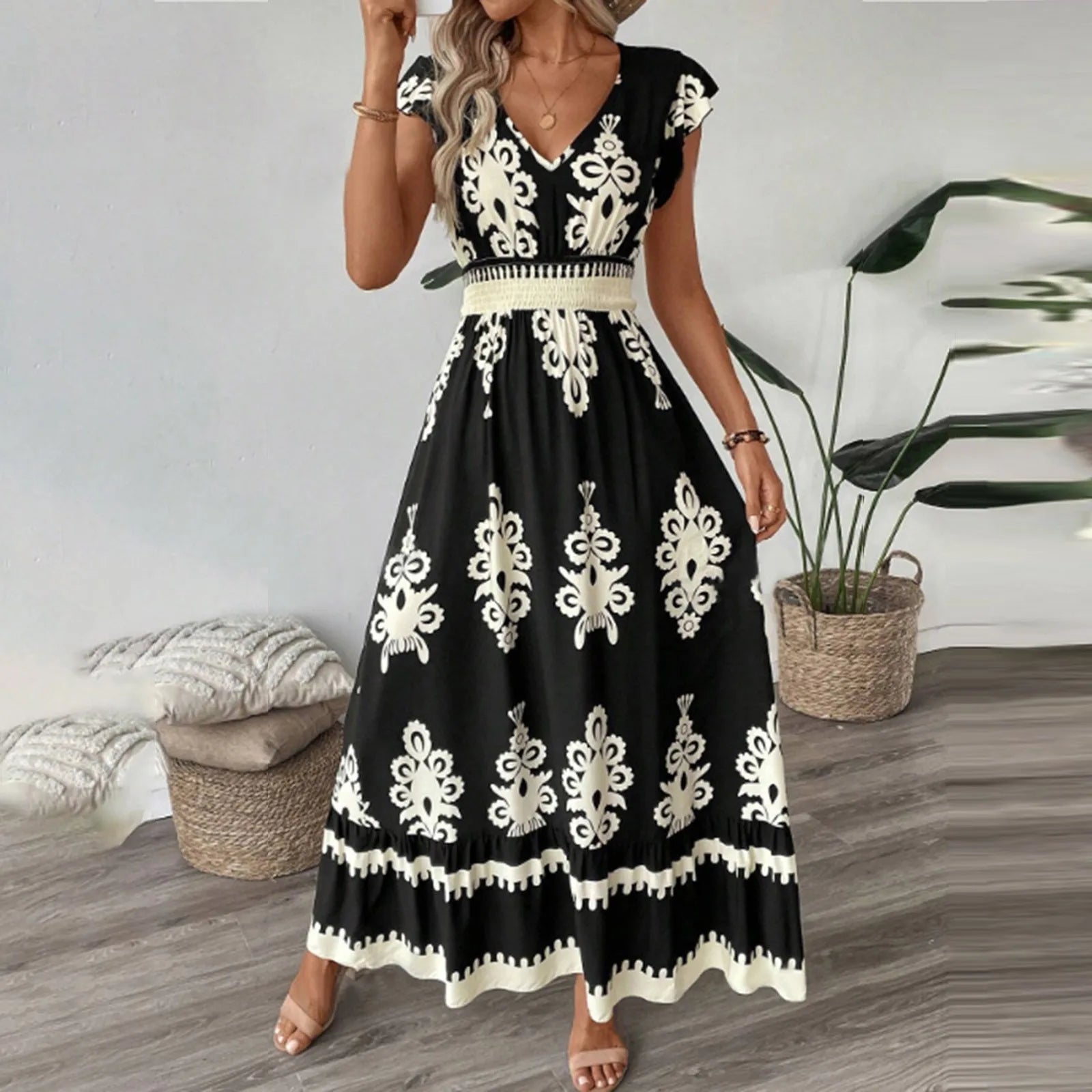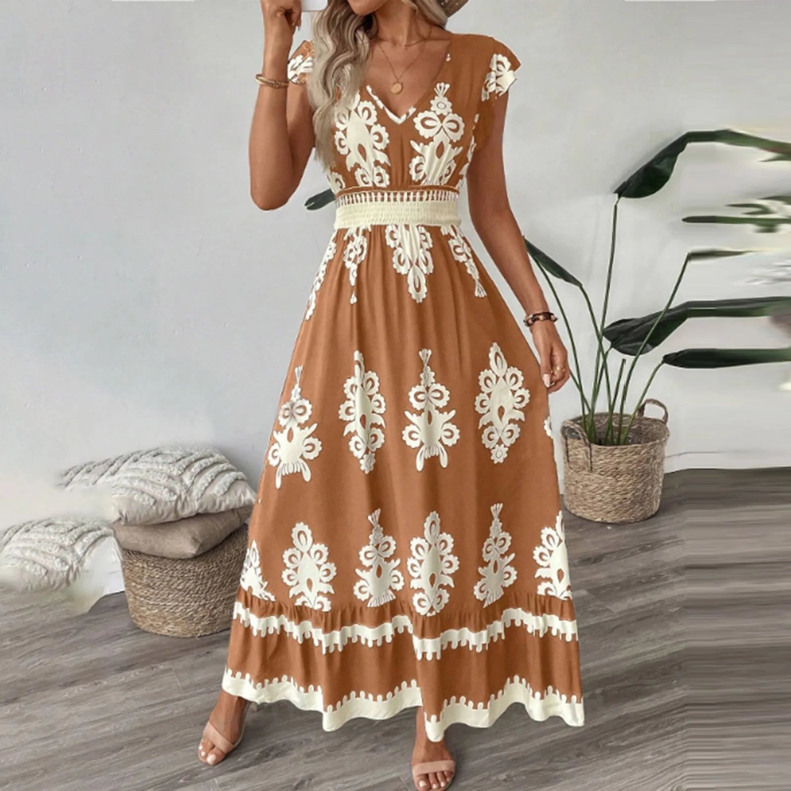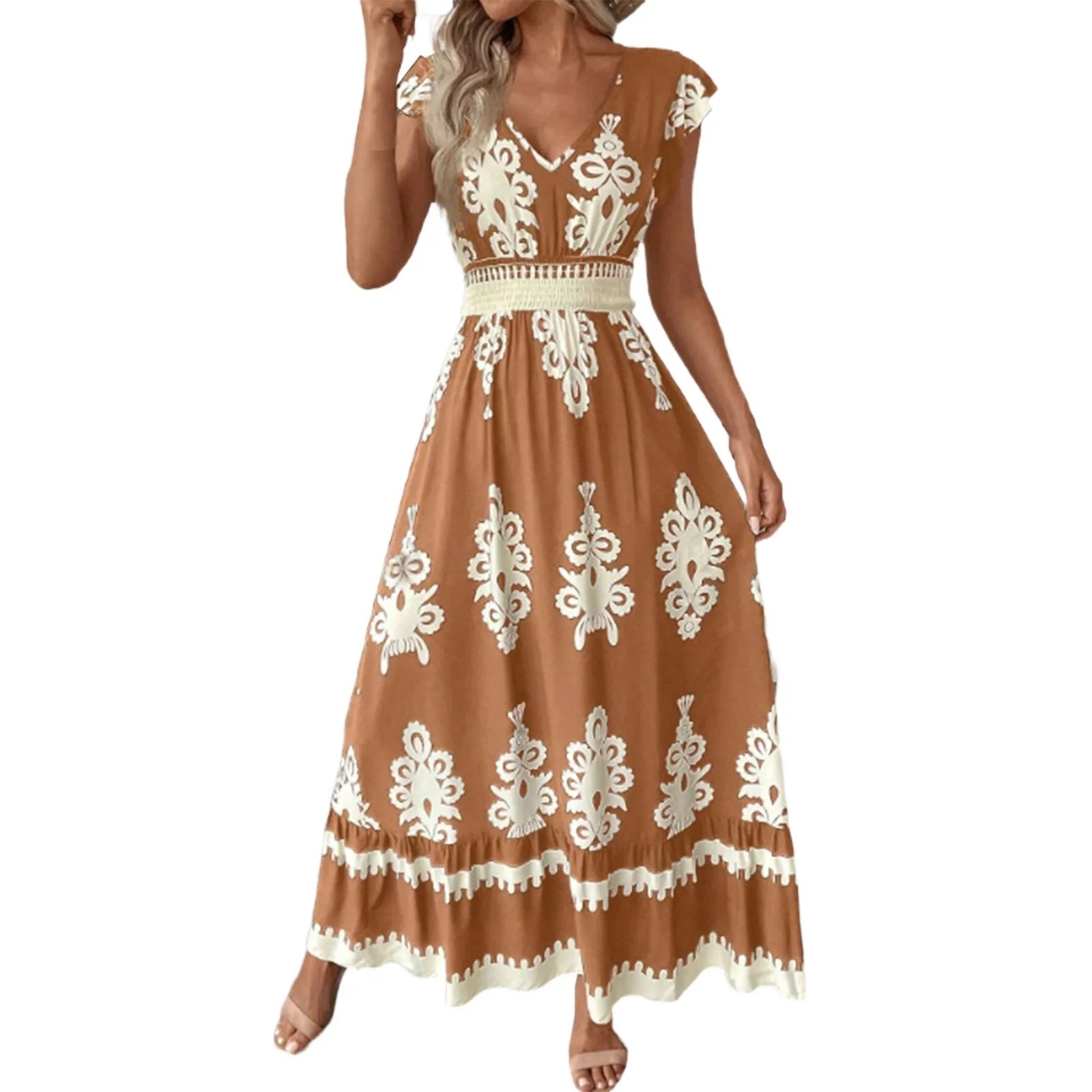 Fashion Sleeveless Maxi Boho Dress Women 2025 Summer Print Waist Bohemian Elegant Short Sleeve Dresses For Women Robe Femme