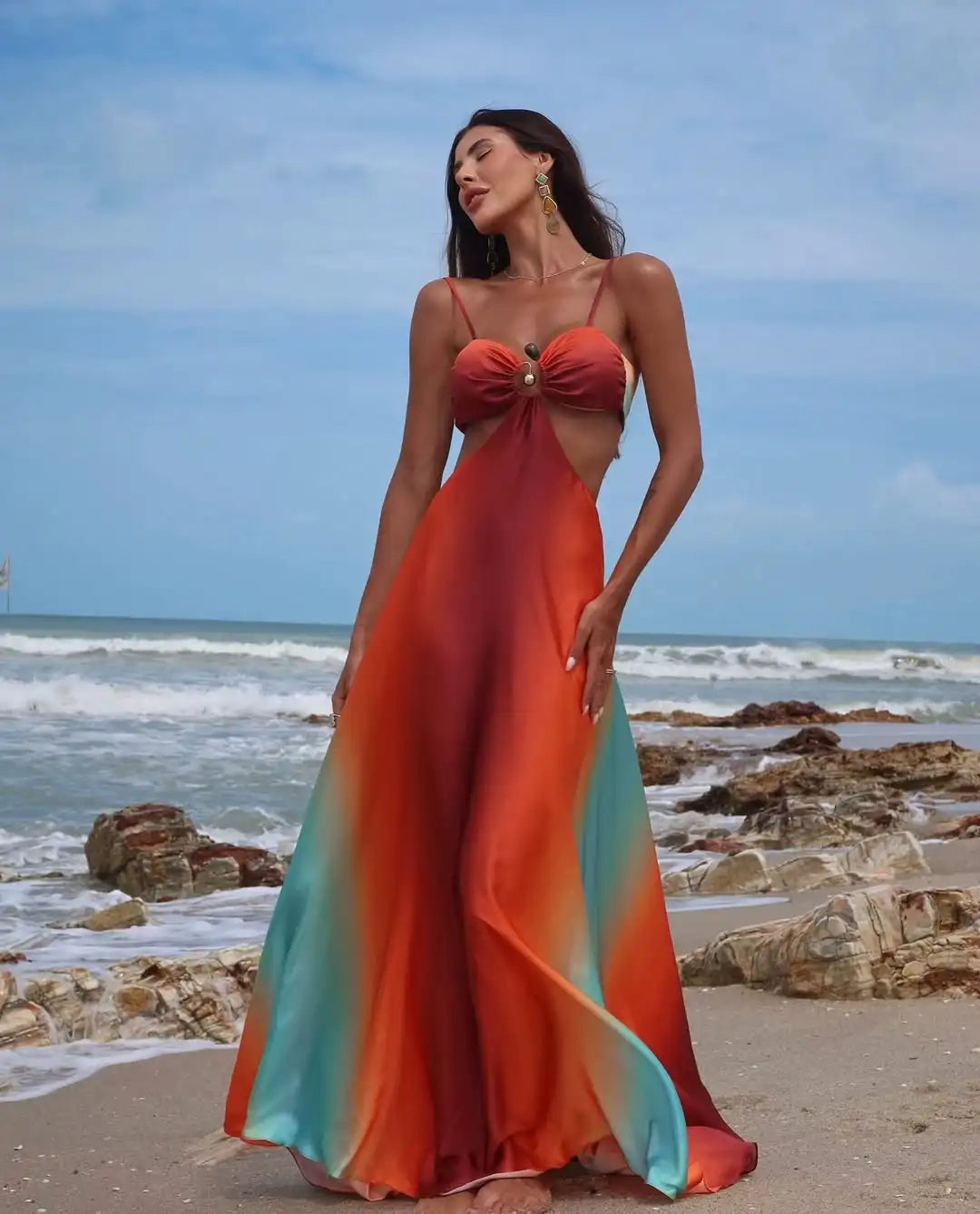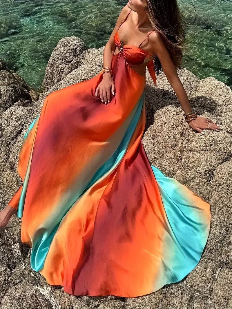 Sexy Striped Maxi Dress - Gradient Orange Blue Sleeveless Backless Cami Dress with Cut-Out Detail for Beach & Party