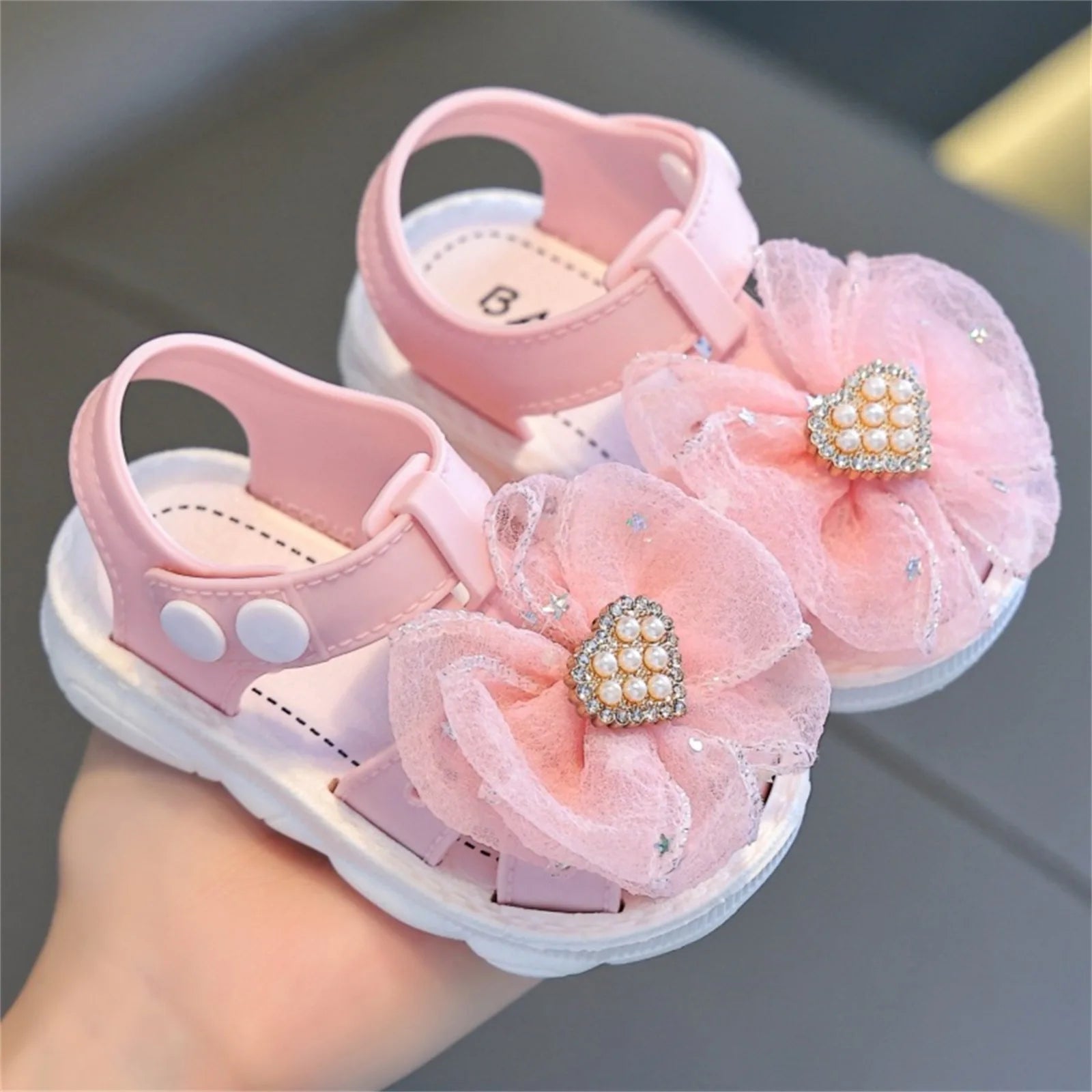 Baby Girl Summer Sandals Sequin Tulle Bow Rhinestone Pearl Hear Soft Sole Non-Slip Closed Toe Walking Flat Shoes